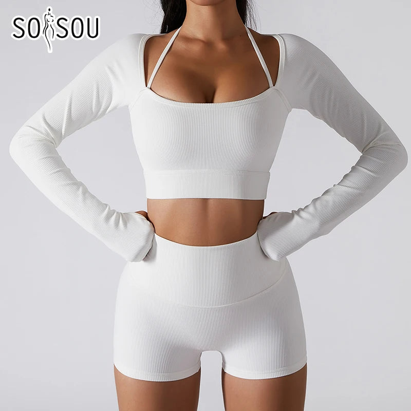 SOISOU Rib Fabric Yoga Shirts Crop Top Seamless Long Sleeve Sports Bra Sport Fitness Workout Tops Gym t Shirt Women 7 Colors